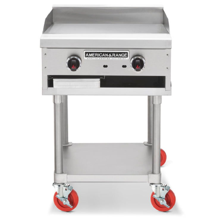 The American Range ACCG-24 Culinary Series Concession Griddle Gas 24" Wide is a commercial-grade countertop griddle designed for high-performance foodservice applications. Built with a 3/4" thick polished steel cooking surface, it provides even heat distribution and durability suitable for continuous use. Equipped with two "H" shaped burners and manual controls, this model offers precise temperature management. Its stainless steel front and sides ensure corrosion resistance, while the grease trough with a removable grease can simplifies cleaning. Operating at 12.0kW and 40,000 BTU, this gas-powered griddle supports efficient cooking in busy commercial kitchens. Made in the USA, the ACCG-24 is a reliable choice for establishments requiring a high-capacity, robust cooking platform with straightforward maintenance and durable construction.