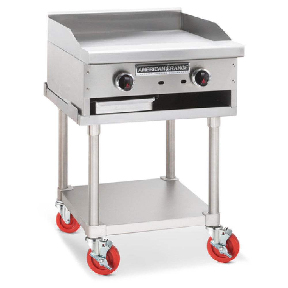 The American Range ACCG-24 countertop gas griddle offers robust build quality, precise temperature control, and reliable performance for medium-volume operations. Its durable stainless steel construction and 24" wide cooking surface make it ideal for quick-service restaurants, concession stands, and cafeteria lines. Designed for operation in busy kitchens, it supports efficient workflow and easy maintenance, providing consistent heat for high-quality food presentation in commercial environments.