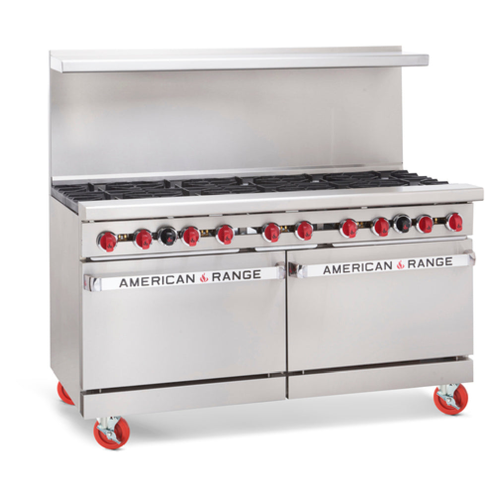 A commercial range gas 60" is a professional-grade cooking appliance designed for high-capacity food preparation in restaurants and catering facilities. This type of range features multiple open burners, heavy-duty stainless steel construction, and baking ovens suited for continuous use. The American Range AR-10_NAT specifically provides ten 32,000 BTU open burners, two ovens with dual racks each, and a spacious 60-inch footprint, optimized for high-volume cooking tasks in busy commercial kitchens and foodservice operations requiring precision, durability, and efficient workflow integration.