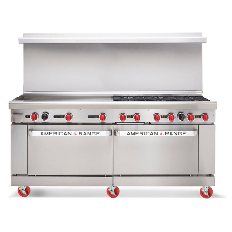 A commercial range is a heavy-duty cooking appliance designed for high-volume foodservice environments. The American Range AR-36G-6B-126L-SBR_NAT is a 72-inch gas-powered unit installed in restaurant kitchens and institutional facilities, offering multiple burners, a griddle, and an oven to support diverse cooking tasks. This model provides precise temperature control and high BTU output, making it ideal for medium-volume operations such as restaurants, cafeterias, and catering kitchens.