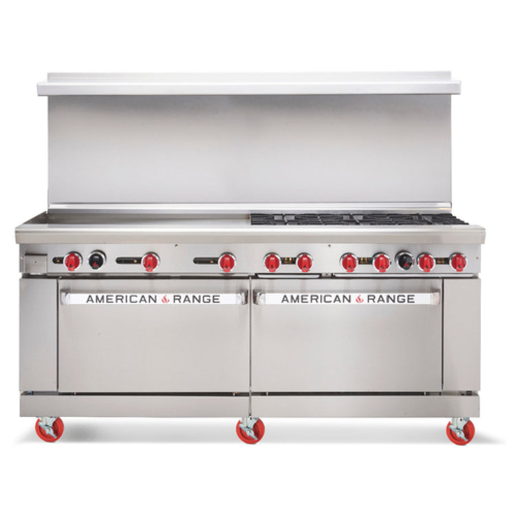 The American Range AR-48G-4B-CL-SBR_LP Restaurant Range Gas 72" is a commercial-grade cooking appliance designed for high-efficiency restaurant kitchens. This 72-inch gas range features a stainless steel front and sides for durability and ease of cleaning. Its top includes four 32,000 BTU open burners and a 48-inch-specific flat griddle with a 1-inch thick plate, optimized for versatile cooking tasks. The unit incorporates a 26-1/2-inch convection oven on the left side, equipped with two racks, and a 26-1/2-inch storage base on the right, making it suitable for mid-volume foodservice operations. Engineered for performance, it delivers 238,000 BTU total power and 70.0 kW of heating capacity, meeting demanding kitchen workflows with precise manual controls. Constructed in the USA, this range is built to withstand rigorous daily use in professional environments, combining heavy-duty stainless steel construction with high-performance burners and a convection oven for comprehensive cooking solutions.