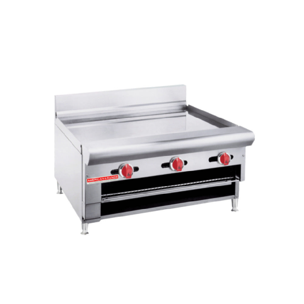 The American Range ARGB-24_LP Raised Griddle/Broiler Gas 24" Wide Cooking Surface is a professional-grade countertop cooking appliance designed for commercial foodservice environments. This unit features a polished 3/4" thick stainless steel griddle plate and dual burners that deliver a combined 40,000 BTU (12.0 kW), enabling high-efficiency heating for versatile cooking tasks. Its overfire broiler incorporates a pull-out rack for precise broiling control, complemented by a removable grease tray and a 3" wide grease trough, facilitating straightforward maintenance. Engineered for durability, this gas appliance is ideal for high-demand kitchens requiring reliable performance in a compact footprint, with stainless steel construction ensuring longevity and easy cleanup. The ARGB-24_LP’s specifications include a 24-inch width, 32-inch depth, 16-inch height, and a total weight of 330 lbs, making it suitable for heavy-duty use in bustling restaurant or catering operations.