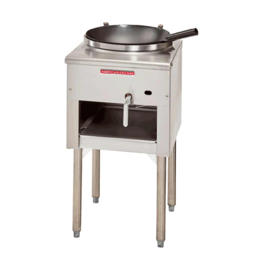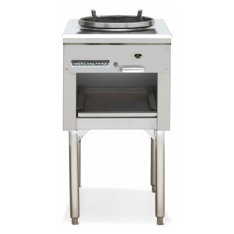 American Range, ARWR-J16, Culinary Series Wok Range, gas, 23 tip jet burner, 16" diameter Wok ring, 2" high opening, brass control valve with aluminum handle, removable grease pan, stainless steel front, sides & tubular legs with adjustable feet, 37.0kW, 125,000 BTU, cETLus, ETL-Sanitation, Made in USA