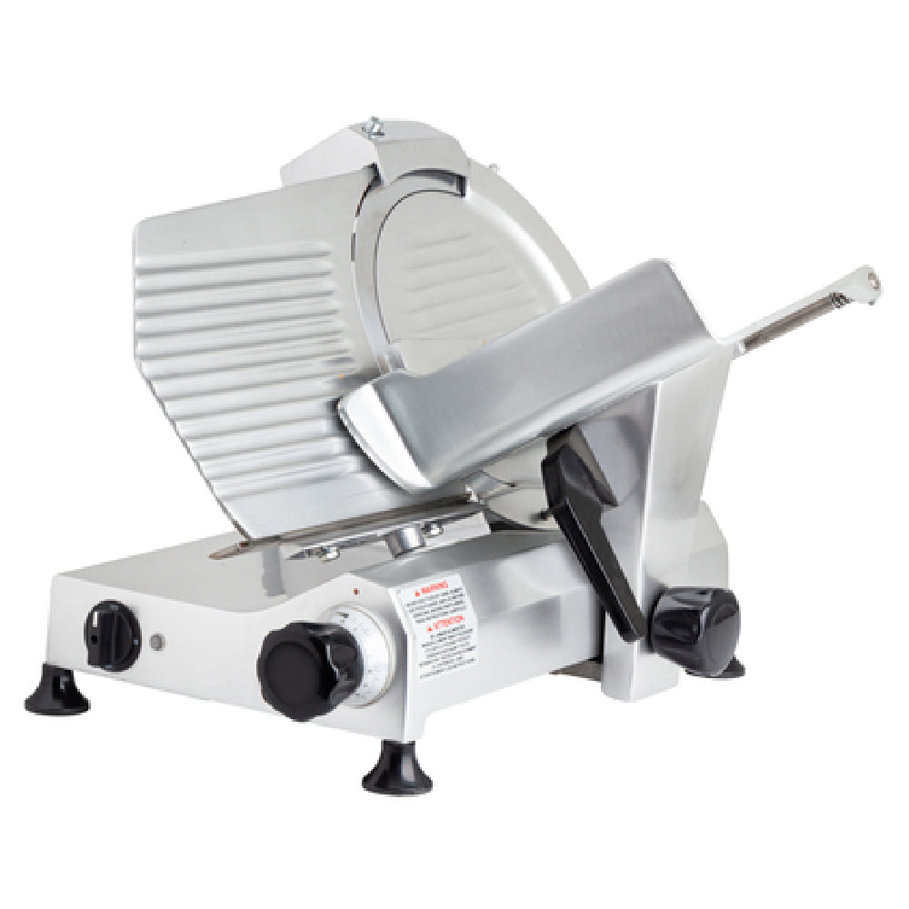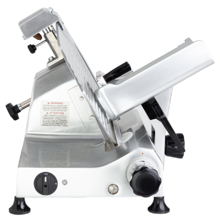 The AMPTO 250E Meat Slicer Medium Duty Manual is a professional-grade food slicer designed for commercial kitchens requiring precise meat slicing. Equipped with a 10-inch stainless steel blade and a manual gravity feed system, this machine ensures consistent, clean cuts up to 5/32 inch thickness. Its belt-driven mechanism and anodized aluminum construction provide durability suitable for moderate workloads, making it ideal for butcher shops, delis, and small foodservice establishments. The unit features a built-in sharpener to optimize blade performance, maintaining efficiency during continuous operation, and is crafted for easy maintenance and reliable functionality in busy culinary environments.
