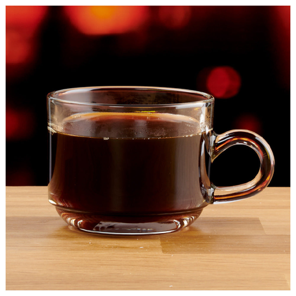 The Anchor Hocking 1P00340 teacup features a glass construction weighing approximately 40.25 lbs per case, designed for robust use in commercial environments. Its material ensures food safety and easy cleaning while supporting high-temperature ranges typical of hot beverage service. The mug is designed with dimensions suitable for ergonomic handling, with a capacity precisely calibrated to 6-3/4 oz. It complies with industry standards for durability and ease of maintenance, making it a practical choice for establishments looking for reliable drinkware. The stacking feature enhances space efficiency, and the clear glass finish allows for visual appeal and quick product identification during busy service periods.