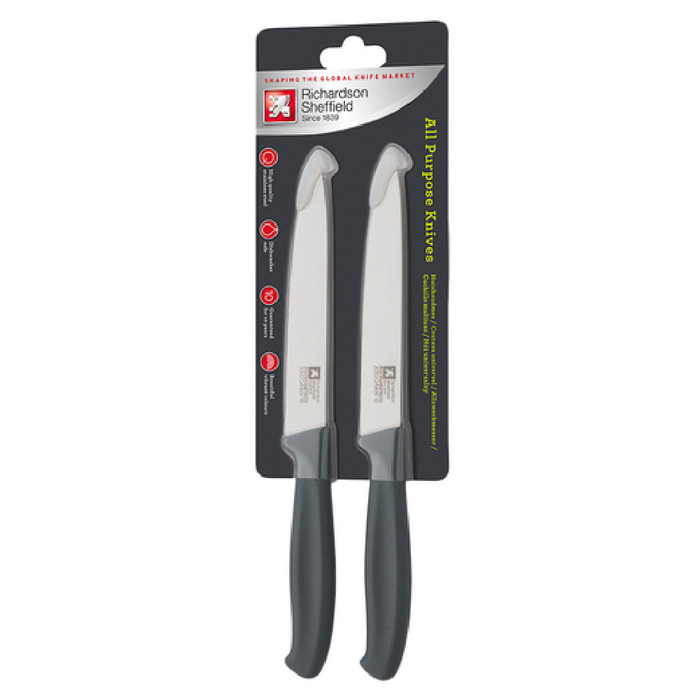 The Arc Cardinal FN227 utility knife features a stamped style with a high carbon stainless steel blade designed for durability and precise cutting. The handle, made of plastic/polypropylene in grey, ensures a comfortable non-slip grip suitable for extended use. The product weighs 0.19 lbs and measures 9-1/4 inches overall length, making it ideal for diverse cutting tasks in busy foodservice settings. It does not include electrical components or refrigeration but is optimized for manual operation in standard commercial kitchens. The knife’s construction allows for easy dishwasher cleaning, supporting sanitation and quick turnaround in high-volume environments. It is intended for moderate workload use, suitable for prep stations and general utility applications. The product is compatible with standard kitchen cutlery arrangements and supports operational safety with rounded handle edges and ergonomic design.