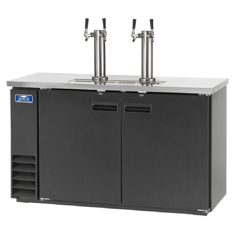 Arctic Air, ADD60R-2, Direct Draw Draft Beer Dispenser, 61"W, 16.7 cu. ft. capacity, side mounted self-contained refrigeration, electronic thermostat with digital LED display, 33°F to 41°F temperature range, (2) tap towers, (2) faucets per tower, interior top ventilated stainless steel duct, (2) solid hinged doors with locks, LED interior lighting, external drain mount, mounted 4-way air distributor, stainless steel interior, reinforced stainless steel threshold & floor, 1-1/2" solid foamed stainless steel countertop, black powder coated steel front & sides, (4) 3-1/4" casters (2 locking), R290 Hydrocarbon refrigerant, 480 BTU/h rejected heated air gain, 2/5 HP, 3.0 amps, cord, NEMA 5-15P, cETLus, ETL-Sanitation