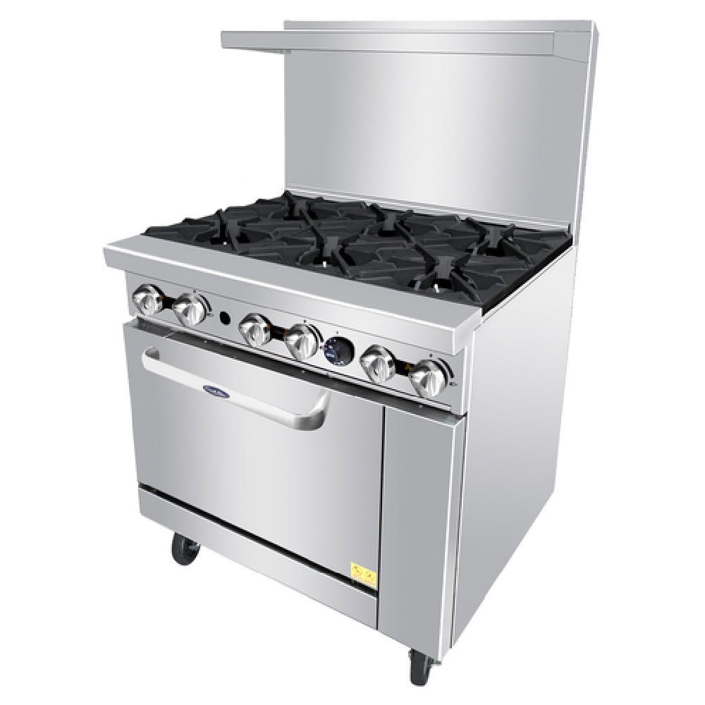 Atosa USA, Inc., AGR-6B-NG, CookRite Range, natural gas, 36"W x 31"D x 57-3/8"H, (6) 32,000 BTU open burners, removable cast iron top grates, (1) 26-1/2"W oven, (2) adjustable chrome oven racks, pilot light, drip tray, stainless steel front, back sides, kick plate, back guard & over shelf, (4) casters, 219,000 total BTU's, cETLus, ETL-Sanitation