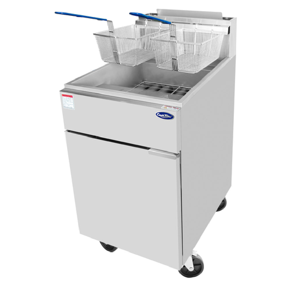 Atosa USA, Inc., ATFS-75-LP, CookRite Fryer, LP gas, floor model, 21-1/10"W x 30-1/10" x 44-2/5"H, 75 lb. capacity, (5) burners, standby pilots, 200°F- 400°F temperature range, self-reset high temperature limiting device, safety valve, (2) nickel plated baskets with coated handles, basket hanger, oil cooling zone seated in the bottom of the tank, stainless steel structure, (4) casters, cETLus, ETL-Sanitation