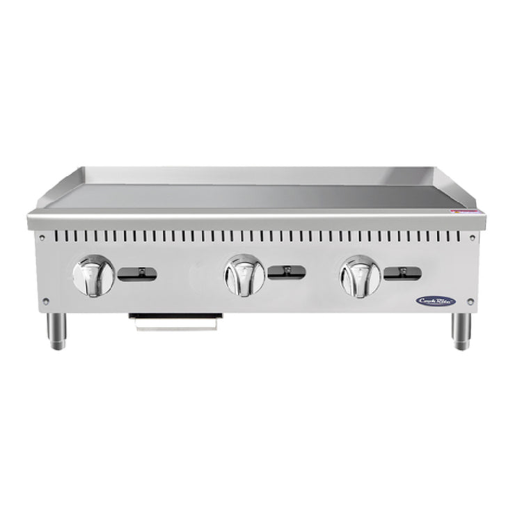 A commercial griddle is a durable countertop cooking appliance designed for high-volume food preparation, featuring a flat steel surface heated by gas or electric elements. The Atosa ATMG-36_LP CookRite Heavy Duty Griddle is a robust gas-powered unit with three stainless steel burners and a thick flat steel plate, ideal for preparing breakfast items, sandwiches, and more in busy foodservice environments. Its 90,000 BTU output supports continuous cooking, making it suitable for mid-volume kitchens, restaurants, or cafeterias where efficiency and consistency are essential.