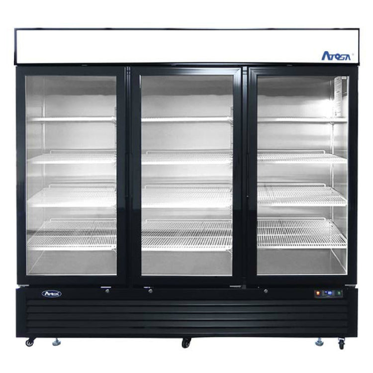 A commercial merchandiser refrigerator is a specialized refrigeration unit designed for displaying perishable products in retail or foodservice settings. It typically features glass doors for visibility, robust construction for durability, and precise temperature control for product freshness. The Atosa MCF8724GR demonstrates these qualities with its three-section design, hinged glass doors with locks, and self-contained refrigeration system, making it suitable for high-traffic venues like grocery stores, convenience stores, or cafeterias where product visibility and accessibility are key. Its precise temperature regulation within 33°F to 38°F ensures optimal storage conditions for dairy, beverages, and prepared foods, supporting efficient workflow in mid-volume commercial environments.