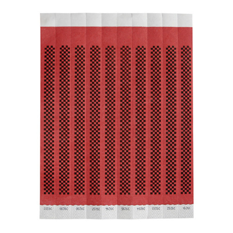The Winco Bar Maid WB-CHECKER wristbands are high-quality, industrial-grade identification accessories designed for use in commercial foodservice environments. Crafted from durable Tyvek material, each band measures 3/4 inch wide by 9.5 inches long, offering a tear-resistant construction suitable for busy restaurant, casino, or event settings. These sequentially numbered wristbands feature a distinctive checkerboard pattern in red and black, facilitating precise attendee or customer management. The WB-CHECKER model is recognized for its reliable performance in high-volume throughput scenarios, providing an effective solution for personnel or guest identification with an emphasis on security and operational efficiency.