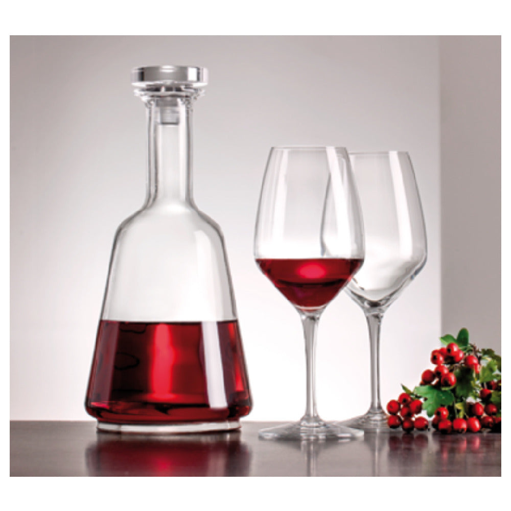 A commercial decanter carafe is a professional beverage container designed for high-volume service environments such as restaurants, bars, and catering venues. Typically constructed from durable, heat-treated glass like SON.hyx® lead-free crystal, it provides clear visibility of contents and withstands the rigors of frequent handling. The BauscherHepp 10700/01 carafe features a capacity of 34 ounces, with reinforced rims for improved impact resistance. Installed in hospitality beverage stations, it accommodates service needs for water, juice, or wine, supporting efficient workflow and optimal presentation in mid-volume restaurant operations or banquet settings.