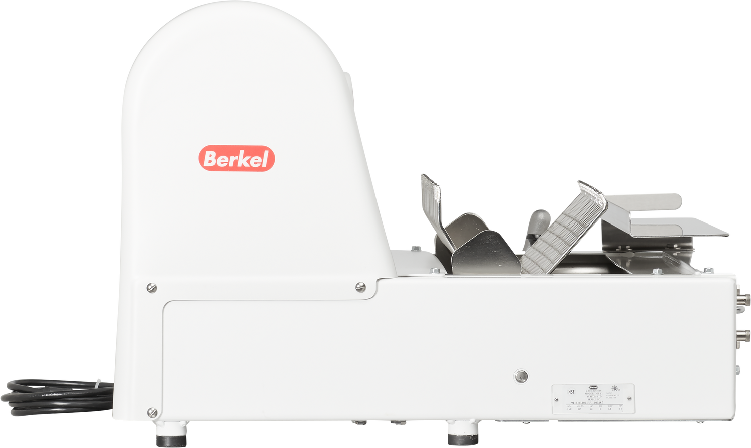 The Berkel MB1/2STD bread slicer features a self-contained, air-cooled motor operating at 115 volts, 60Hz, and 1-phase power, with a 1/3 HP motor producing efficient slicing capacity. Constructed with stainless steel housing finished in white polyester powder coating, it ensures sanitation and ease of cleaning. Its weight of 219 lbs and dimensions of 25 inches wide by 27 inches deep and 19 inches high facilitate installation on countertops in medium-volume kitchens. The alloy carbon steel blades provide a precise cut with a 1/2" to 5/8" slice size range, suitable for bakery and deli settings. All components comply with food safety standards, and maintenance involves disassembly of the removable scrap pan for routine cleaning. Additional features include a safety guard and comprehensive certification support safe operation in commercial foodservice environments.