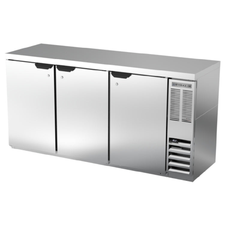 The Beverage Air BB72HC-1-S-27 features a three-section layout with solid doors and locks for security, epoxy-coated steel shelves to resist corrosion, and a stainless steel top for durability. Its self-contained refrigeration system efficiently maintains consistent temperatures suitable for beverage storage, with integrated LED lighting offering enhanced visibility. Designed for ease of maintenance, the unit supports quick cleaning and reliable operation, fitting seamlessly into bar or commercial kitchen workflows and accommodating limited space efficiently.