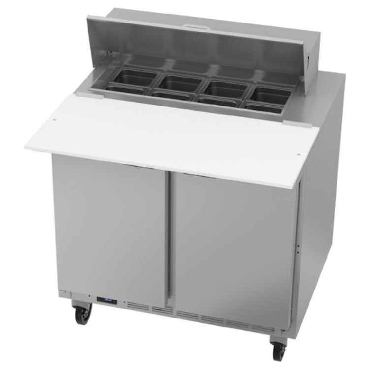 The Beverage Air SPE36HC-08C Sandwich Top Refrigerated Counter is a commercial-grade, two-section refrigerated unit designed for precise cold food storage and service. Featuring a 36-inch width and an interior capacity of 10.01 cubic feet, this refrigerated counter accommodates (2) hinged doors with four epoxy-coated wire shelves—two per door—optimized for organized, durable storage. Its stainless steel top includes an opening for (8) 1/6 size pans, complemented by a 17-inch cutting board, making it suitable for high-volume food prep and display in fast-paced foodservice environments. Equipped with rear-mounted self-contained refrigeration and utilizing R290 hydrocarbon refrigeration, it offers efficient thermal performance. The unit’s stainless steel exterior and aluminum interior ensure durability and ease of cleaning, ideal for busy commercial kitchens requiring reliable sanitation and consistent operation.