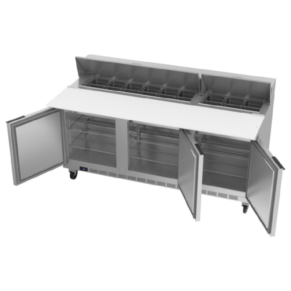 The Beverage Air SPE72HC-18C Sandwich Top Refrigerated Counter is a professional-grade cold storage solution designed for commercial kitchens requiring precise product organization and efficient workflow. Featuring a three-section design and a 72" width, this unit provides a total capacity of 20.02 cubic feet, accommodating (3) doors with stainless steel front, top, and sides for durability and sanitation. The refrigerated counter includes an open stainless steel top for (18) 1/6 size pans, along with a 17" cutting board, six adjustable shelves, and aluminum interior walls. Rear-mounted self-contained refrigeration with R290 hydrocarbon refrigerant ensures reliable cooling, while front breathing compressors facilitate maintenance. Manufacturing specifics include a weight of 438 lbs, with dimensions of 72"W x 38.38"D x 45"H, making it suitable for various foodservice applications where durability and technical performance are critical.