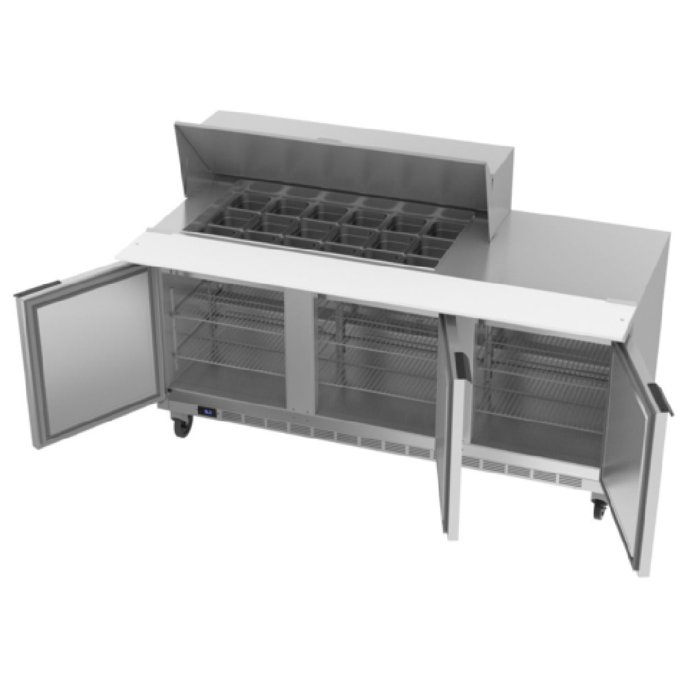 Beverage Air, SPE72HC-18M, Mega Top Refrigerated Counter, three-section, 72"W, 20.02 cu. ft. capacity, (3) doors, stainless steel top with opening for (18) 1/6 size pans, 10" cutting board & available counter space, (6) shelves, stainless steel exterior top, front, sides & doors, galvanized steel exterior bottom and back, aluminum interior, rear-mounted self-contained refrigeration, (pans furnished are 4" deep, tops will accommodate 6" deep pans), R290 Hydrocarbon refrigerant, 1/3 HP, cULus, UL EPH Classified, UL-Sanitation, Made in USA