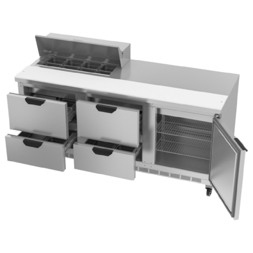 The Beverage Air SPED72HC-08-4 stands out with its high-quality stainless steel construction, reliable self-contained refrigeration, and versatile storage options tailored for successful foodservice operations. Its integrated design promotes workflow efficiency and sanitation, enhancing food presentation and storage in demanding commercial environments.