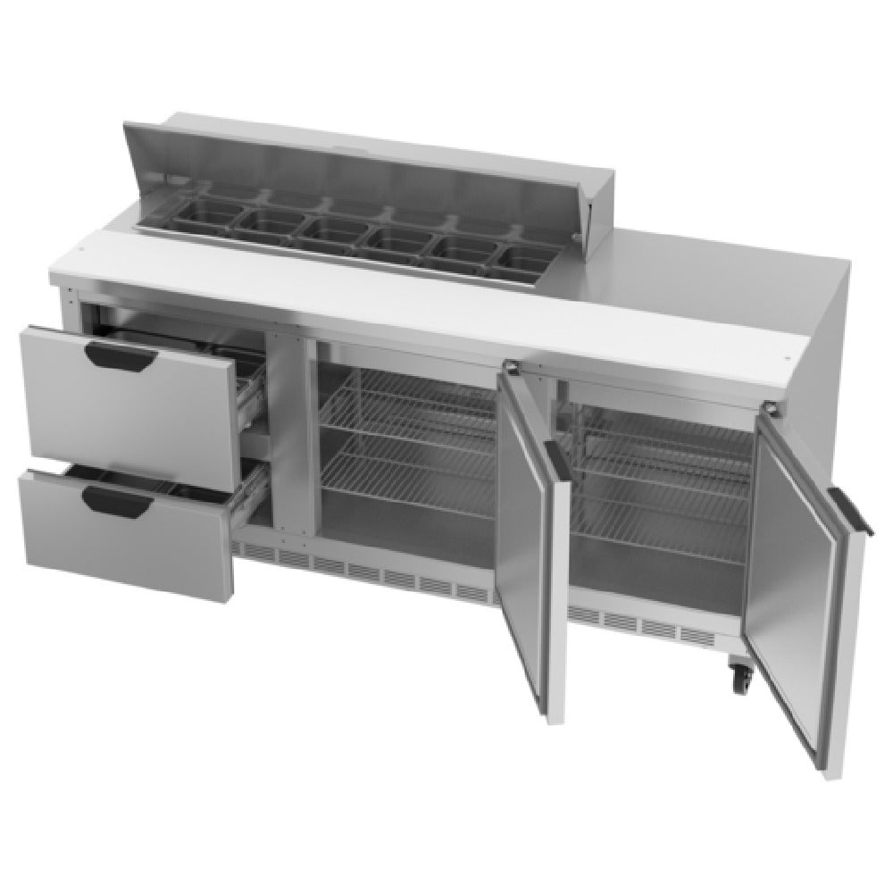 Beverage Air SPED72HC-12-2 72 Inch Sandwich Top Refrigerated Counter 20 Cu Ft 3 Section Stainless Steel with Drawers and Shelves