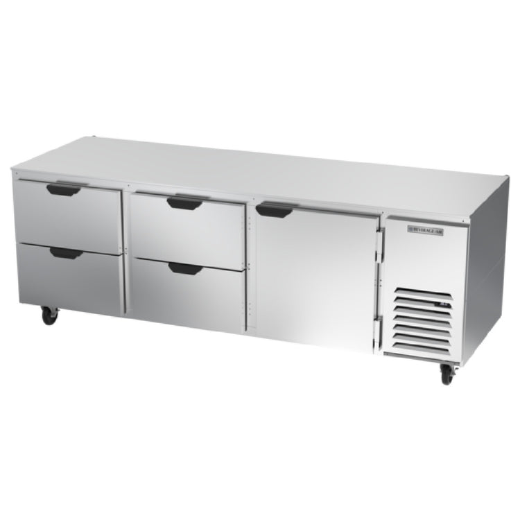 The Beverage Air UCRD93AHC-4 Undercounter Refrigerator is a commercial-grade refrigeration unit designed for efficient food storage in high-volume foodservice environments. Featuring a three-section configuration with a total width of 93 inches and a capacity of 39.8 cubic feet, it provides organized storage with (4) drawers and (1) solid door, complemented by (2) adjustable shelves. Constructed with a stainless steel exterior and aluminum interior, this unit offers robust durability while maintaining a sleek appearance suitable for professional kitchens. Side-mounted self-contained refrigeration using R290 hydrocarbon refrigerant ensures energy-efficient cooling. Precise technical specifications include a 1/3 HP compressor, operating on standard electrical requirements, tailored for commercial restaurant operations requiring dependable refrigeration performance and streamlined workflow integration.