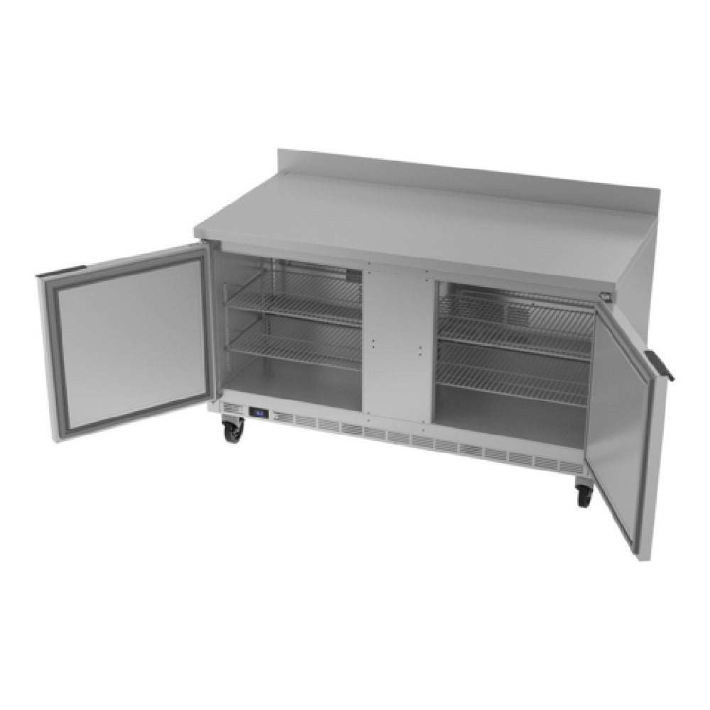 Beverage Air, WTR60AHC, Worktop Refrigerator, two-section, 60"W, 14.75 cu. ft., (2) solid doors, (4) shelves, stainless steel front, 2-1/2" thick top & sides, aluminum interior, 4" removable backsplash, rear-mounted self-contained refrigeration, R290 Hydrocarbon refrigerant, 1/5 HP, cULus, UL EPH Classified, UL-Sanitation, Made in USA