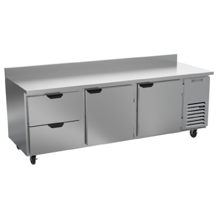A commercial refrigerated counter worktop is a durable, self-contained cooling appliance with a workspace surface, designed for foodservice environments such as restaurants, cafeterias, and catering stations. It combines refrigeration with accessible storage in a robust, easy-to-clean exterior—ideal for keeping ingredients and supplies at optimal temperature while facilitating efficient workflow. The Beverage Air WTRD93AHC-2 Worktop Refrigerator offers three sections with drawers and hinged doors, providing 29.7 cu. ft. capacity and built-in insulation, making it suitable for moderate throughput operations and versatile food prep settings.