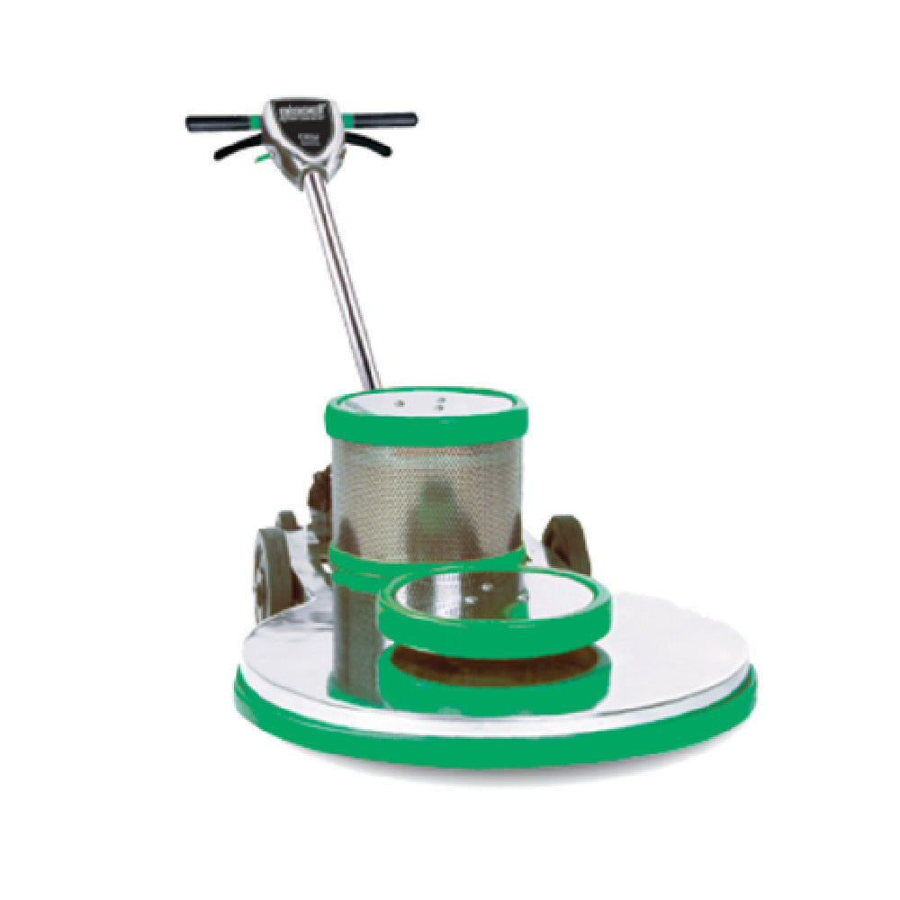 The Bissell BGDC-21-2000 Floor Machine is tailored for commercial flooring tasks with a 21-inch pad and 2000 RPM speed to facilitate efficient scrubbing, stripping, and polishing. Its adjustable handle allows customization for operator comfort during extended use, while the 4-inch transport design and 6-inch non-marking wheels enable seamless maneuverability across various flooring types. Built with a polished aluminum chassis, it offers exceptional durability and corrosion resistance, ideal for heavy-duty environments requiring reliable, consistent cleaning performance.