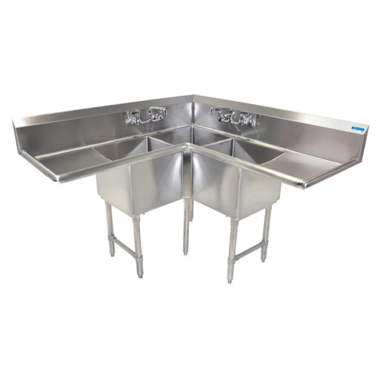 The BK Resources BKCS-3-24-14-24TS Corner Sink with three compartments is a commercial-grade, stainless steel corner unit designed for high-efficiency foodservice environments. Measuring 75" in width and depth with a height of 43-1/2", it features three 24" wide x 14" deep compartments, complemented by two 24" drainboards on each side. Constructed from 18-gauge 300 series stainless steel, this sink provides exceptional durability, corrosion resistance, and ease of maintenance suitable for busy kitchens requiring reliable sanitation and workflow integration. Its robust design and precise specifications support demanding restaurant, cafeteria, or institutional cleaning and prep tasks, optimizing operational productivity with a focus on hygiene standards and structural integrity.