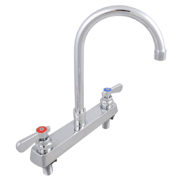 The BK Resources BKF-8DM-8G-G OptiFlow™ Heavy Duty Solid Body Faucet, designed for commercial foodservice applications, features a robust solid cast body construction that ensures durability and long-term performance in high-demand kitchen environments. This deck-mounted faucet is equipped with an 8-inch center-to-center mounting configuration, a gooseneck spout with an overall length of 8 to 9 inches, and a double O-ring spout seal for leak prevention. Utilizing 1/4 turn ceramic cartridges, it facilitates precise control and ease of operation. The high-polished chrome finish provides enhanced corrosion resistance and an impeccable appearance, making it suitable for heavy use in busy restaurant or institutional kitchens. The unit complies with lead-free standards and is NSF and cCSAus certified, showcasing its integrity for food safety and sanitation. Suitable for installations requiring high durability and reliable performance, the OptiFlow™ Heavy Duty Faucet is ideal for high-traffic commercial kitchens where robust fixtures are essential for operational efficiency.