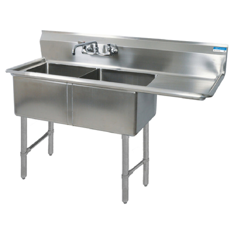 The BK Resources BKS-2-18-12-18RS Sink Two Compartment is a commercial-grade stainless steel wash station designed for high-efficiency foodservice operations. Measuring 56-1/2" wide by 23-13/16" deep and 43-3/4" high overall, this two-compartment sink features 18" wide by 18" front-to-back with 12" deep compartments, optimized for quick and thorough cleaning in busy kitchens. Its 300 Series 18-gauge stainless steel top ensures durability and ease of maintenance, suitable for use in restaurant, cafeteria, or institutional settings requiring robust sanitation standards. The integrated 18" drainboard on the right allows for efficient dish drying and handling, while the 9" backsplash prevents water splashes and maintains workspace cleanliness. Equipped with stainless steel legs and side crossbracing, along with adjustable over plastic feet, it provides stability and adaptability in diverse kitchen layouts. This self-contained unit’s technical configuration aligns with demanding commercial foodservice workflows and spatial constraints, offering a practical solution for intensive washing applications.