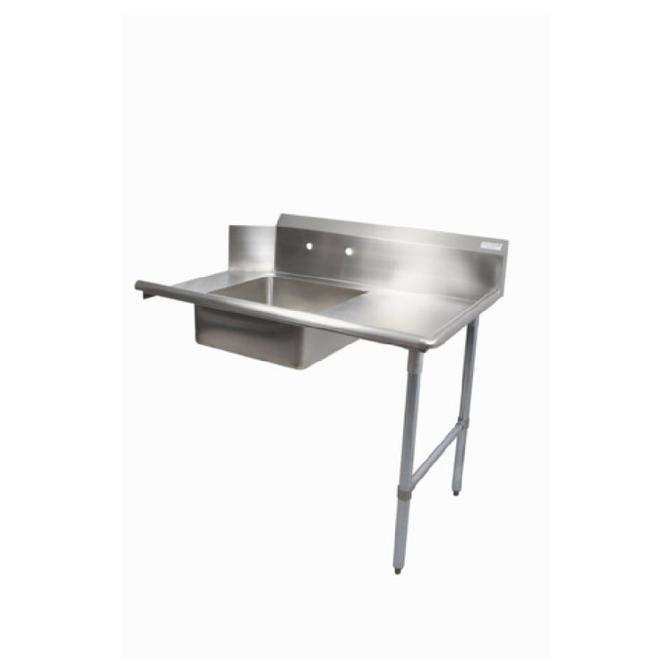 The BK Resources BKSDT6-60-R-SS Heavy Duty Soiled Dishtable with straight design is a commercial-grade foodservice workstation engineered for demanding kitchen environments. Constructed with a 16-gauge 304 series stainless steel top, it provides excellent durability and corrosion resistance. Measuring 60 inches in width, 30-7/8 inches in depth, and standing at 46-1/4 inches tall, this dishtable features a right-to-left operation, making it suitable for various prep line configurations. It incorporates a 10-inch high backsplash to contain water and debris, along with a 20-inch by 20-inch by 8-inch deep pre-rinse sink equipped with 8-inch oc splash mount faucet holes. Raised rolled edges on the front and sides facilitate cleaning and prevent spills, while galvanized steel legs with side bracing ensure stability during heavy use. Built with NSF standards, this unit meets rigorous sanitation and operational requirements, making it a core component for food prep stations in commercial kitchens that require robust, reliable equipment for handling soiled dishware and utensils.