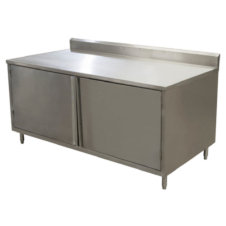 The BK Resources CSTR5-3072H Work Table Cabinet Base with Hinged Doors is a commercial-grade stainless steel workstation designed for foodservice environments requiring durable under-counter storage and prep space. Measuring 72 inches wide by 30 inches deep and standing 39-3/4 inches tall, this unit features a 14/304 stainless steel top with a 5-inch backsplash, coupled with an 18/304 stainless steel body for robustness and corrosion resistance. Equipped with a single set of hinged doors, the cabinet provides secure storage for kitchen tools and supplies, making it ideal for busy kitchens, catering operations, and healthcare foodservice areas demanding high hygiene standards and efficient workflow integration.