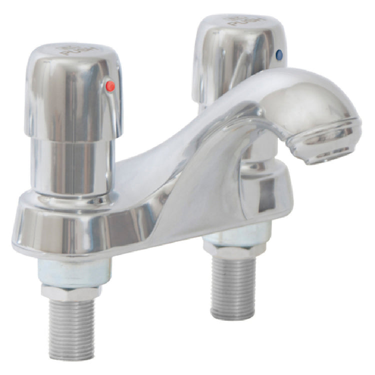 The BK Resources MF-4D-G metering faucet offers a combination of durable chrome-plated brass construction with vandal-resistant push handles and integral spout. Its adjustable metering cartridges enable precise water flow control, while the 2.0 gpm aerator ensures efficient water use. Designed for deck mounting with a 4" centers configuration, it simplifies installation and maintenance in demanding foodservice settings, ensuring uniform water delivery with high durability standards.