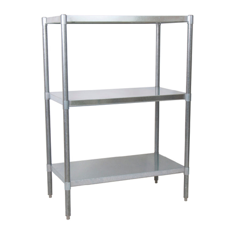 The BK Resources VSU5-6724 Dry Storage Shelving Unit is a commercial-grade shelving solution designed for durable, efficient organization in foodservice environments. Measuring 67 inches wide by 24 inches deep and standing 60 inches high, this stationary unit features three fully adjustable galvanized shelves and robust galvanized legs with adjustable bullet feet for stability. Constructed for heavy-duty use, it provides optimal storage capacity for dry ingredients, equipment, and supplies, making it suitable for institutional kitchens, catering facilities, and foodservice operations that demand reliable, corrosion-resistant shelving with easy customization.