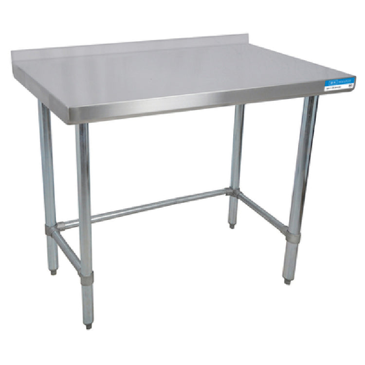 This work table offers a durable 18-gauge stainless steel top with reinforced channels and a turndown edge, ideal for heavy-duty food preparation. The open galvanized base with crossbracing supports vigorous use, while adjustable, corrosion-resistant feet facilitate level setup. Its size and construction make it a versatile choice for high-traffic kitchens, bakeries, and catering setups, promoting streamlined workflow and sanitation.
