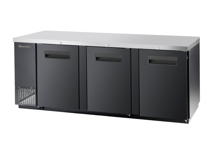 Blue Air FSE LLC, BBB90-4B-HC, Back Bar Cooler, three-section, 90-3/8"W, side-mounted self-contained refrigeration, stainless steel top, (3) locking solid doors, (6) adjustable shelves, interior LED lighting, galvanized steel interior with stainless steel floor, black laminated exterior, R290 Hydrocarbon refrigerant, 3/8 HP, 115v/60/1-ph, 3.5 amps, cord with NEMA 5-15P, cUL, UL, ETL-Sanitation