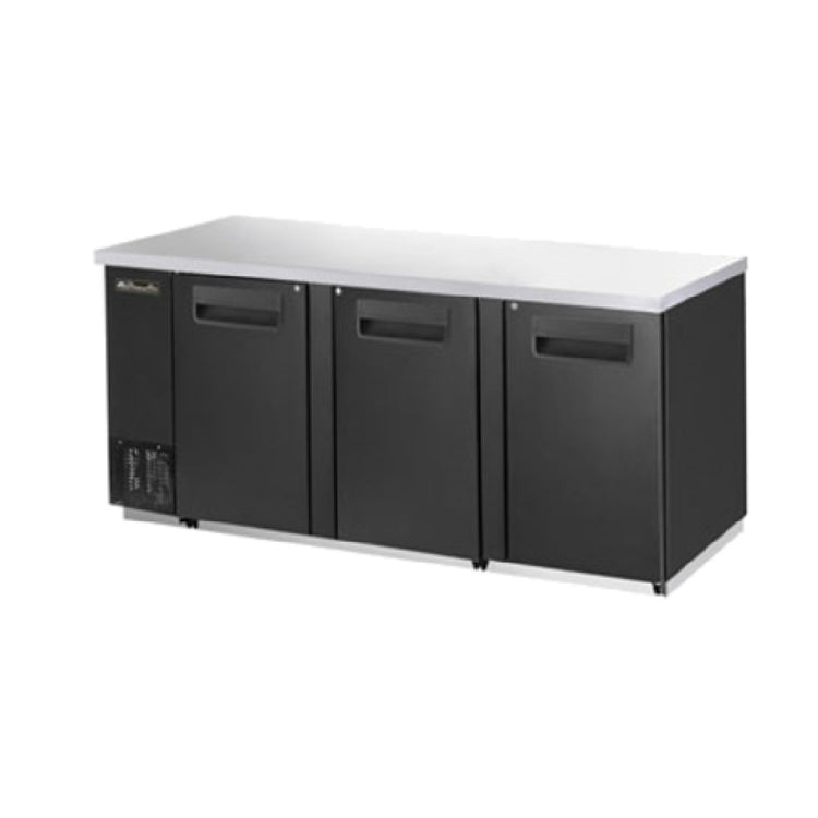 Blue Air FSE LLC, BBB90-4S-HC, Back Bar Cooler, three-section, 90-3/8"W, side-mounted self-contained refrigeration, stainless steel top, (3) locking solid doors, (6) adjustable shelves, interior LED lighting, galvanized steel interior with stainless steel floor, stainless steel exterior, R290 Hydrocarbon refrigerant, 3/8 HP, 115v/60/1-ph, 3.5 amps, cord with NEMA 5-15P, cUL, UL, ETL-Sanitation