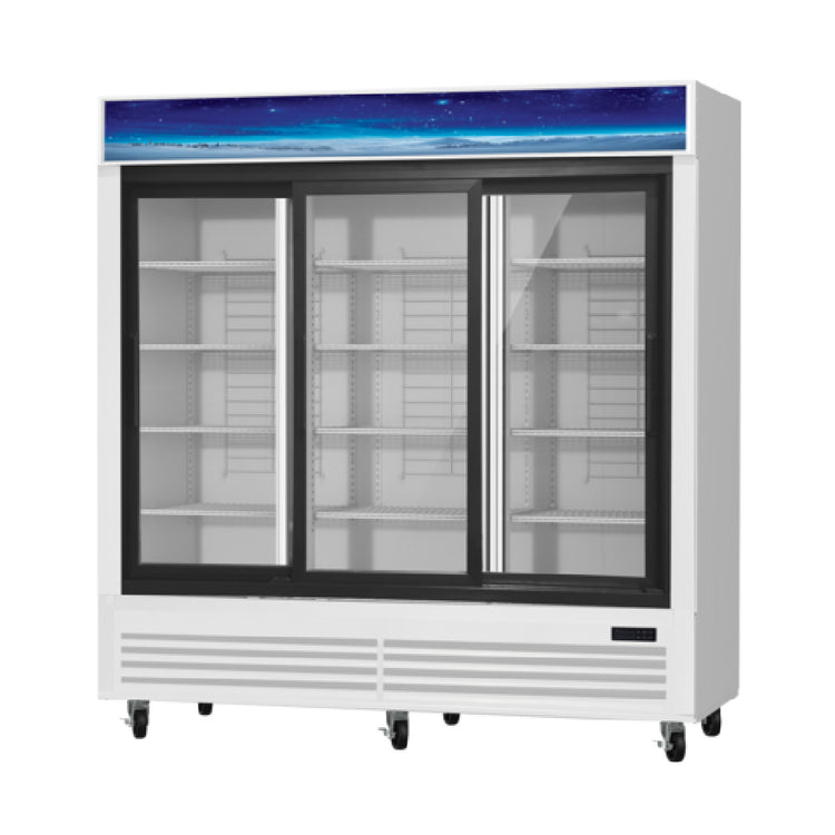 Blue Air FSE LLC, BGM69SLW-HC, Refrigerated Merchandiser, two-section, 61 cu. ft. capacity, bottom-mount self-contained refrigeration, (3) double pane sliding glass doors, (12) adjustable epoxy coated wire shelves, LED interior lighting, backlit graphic panel, digital monitoring system, white painted steel exterior and trim, white painted steel interior, (4) 4" swivel casters (2 braked), R290 Hydrocarbon refrigerant, 3/4 HP, 115v/60/1-ph, 7.5 amps, cord, NEMA 5-15P, cULus, ETL-Sanitation