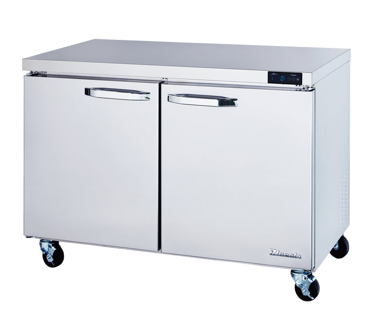 Blue Air FSE LLC, BLUF48-HC, Undercounter Freezer, two-section, 48-3/8"W, 13.1 cu. ft. capacity, rear-mounted self-contained refrigeration, -10° to 0°F temperature range, (2) self-closing swing door, metal door handle, open door alarm, (4) adjustable wire shelves, self-diagnostic digital temperature control & monitor system, stainless steel interior & exterior, (4) 4" swivel casters (2 braked), R290 Hydrocarbon refrigerant, 1/2 HP, 115v/60/1-ph, 6.0 amps, cord with NEMA 5-15P, cETLus, ETL-Sanitation