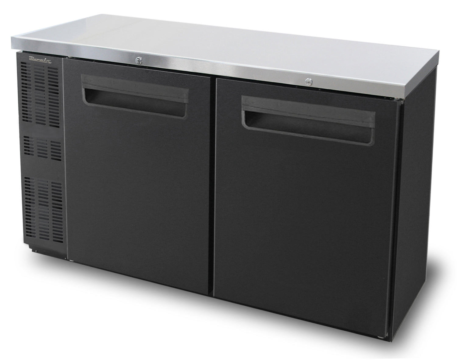 Blue Air FSE LLC, BNB-60BT-HC, Back Bar Cooler, two-section, shallow depth, 60-1/4"W, side-mounted self-contained refrigeration, stainless steel top, (2) solid hinged doors (locking), recessed door handle, (4) adjustable shelves, interior LED lighting, automatic defrost, galvanized steel interior with stainless steel floor, black laminated exterior, R290 Hydrocarbon refrigerant, 3/8 HP, 115v/60/1-ph, 3.5 amps, cord with NEMA 5-15P, cUL, UL, ETL-Sanitation