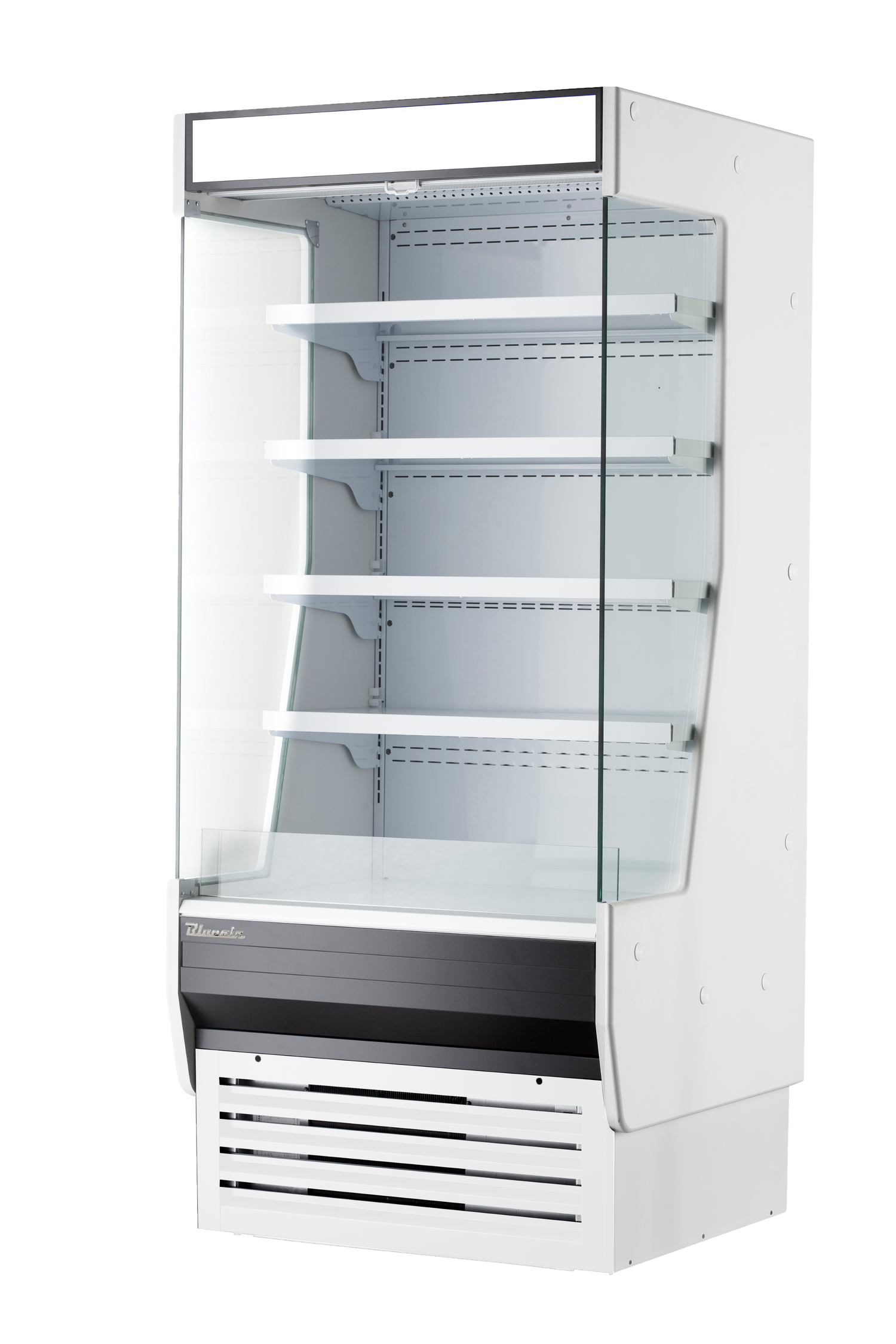 Blue Air FSE LLC, BOD-36G, Open Display Case, 36-1/16"W, 19.5 cu. ft. capacity, bottom mount self-contained refrigeration, open front, glass side panels, (4) adjustable shelves, LED interior lighting, rear air guard, night curtain, pre-coated steel for the exterior, and non-peel durable powder-coated steel for the interior, 1 HP, 115v/60/1-ph, cord with NEMA 5-20P, cUL, UL, ETL-Sanitation (It requires 8-12 weeks leadtime for white color)