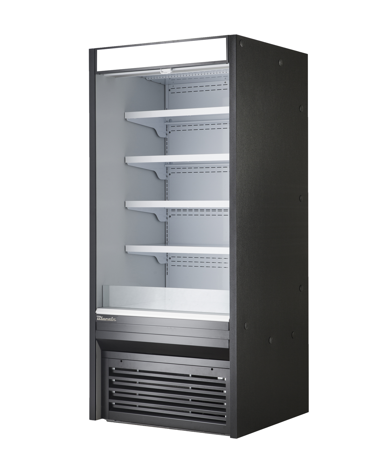 Blue Air FSE LLC, BOD-48S, Open Display Case, 48-1/16"W, 26.7 cu. ft. capacity, bottom mount self-contained refrigeration, open front, solid side panels, (4) adjustable shelves, LED interior lighting, rear air guard, night curtain, pre-coated steel exterior, non-peel powder-coated steel interior, 1 HP, 115v/60/1-ph, cord with NEMA 5-20P, cUL, UL, ETL-Sanitation