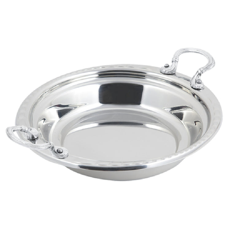 A commercial steam table pan is a foodservice vessel designed for hot food presentation and holding in professional kitchens and catering settings. Typically constructed from stainless steel, these pans are used to organize, display, and maintain food temperatures in buffet lines, banquet services, or cafeteria setups. The Bon Chef 5655HRSS model features a round shape with precise dimensions of 13" x 12-1/4" x 2-5/8", offering a 2-1/2 quart capacity. Equipped with vapor lock shoulder and stainless steel handles, it is optimized for durable, leak-proof performance during extended holding periods, making it suitable for high-volume restaurant and institutional use.