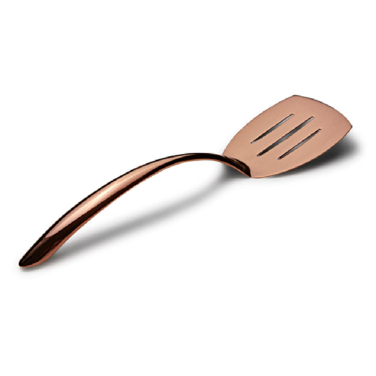 The Bon Chef 9460RG features a length of 14-3/4", crafted from high-grade 18/8 stainless steel with a rose gold PVD coating that ensures resistance to corrosion and wear. Its hollow cool handle design provides optimal heat dissipation, supporting prolonged use in hot foodservice settings. The unit weighs approximately 0.48 lbs, making it lightweight yet durable enough for commercial usage. This turner is designed for routine cleaning in industrial dishwashers, with a mirror finish that promotes cleanliness and professionalism. It meets standard commercial kitchen equipment requirements, tailored for banquet and catering operations, with a temperature resistance suitable for hot serving environments up to 400°F (204°C). Its construction with stainless steel ensures food safety compliance and longevity.
