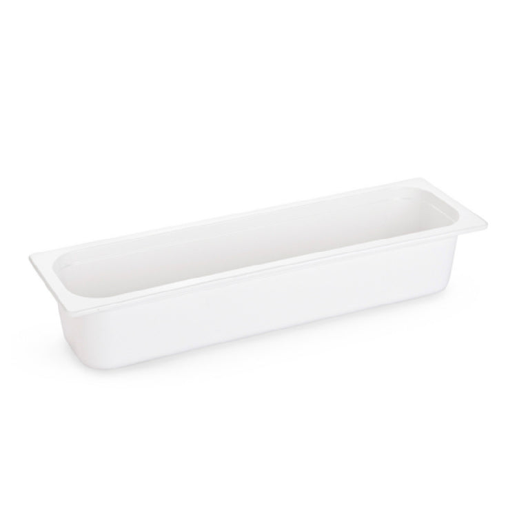 This long food pan offers a robust and versatile solution for commercial kitchens, featuring a sturdy melamine construction resistant to chipping and staining. Its 4-inch depth supports a variety of ingredients, while its 20.75" x 6.44" size allows for seamless integration into prep lines or buffet stations. Designed for easy handling and cleaning, it streamlines workflow, reduces contamination risk, and ensures food presentation remains optimal during service hours.