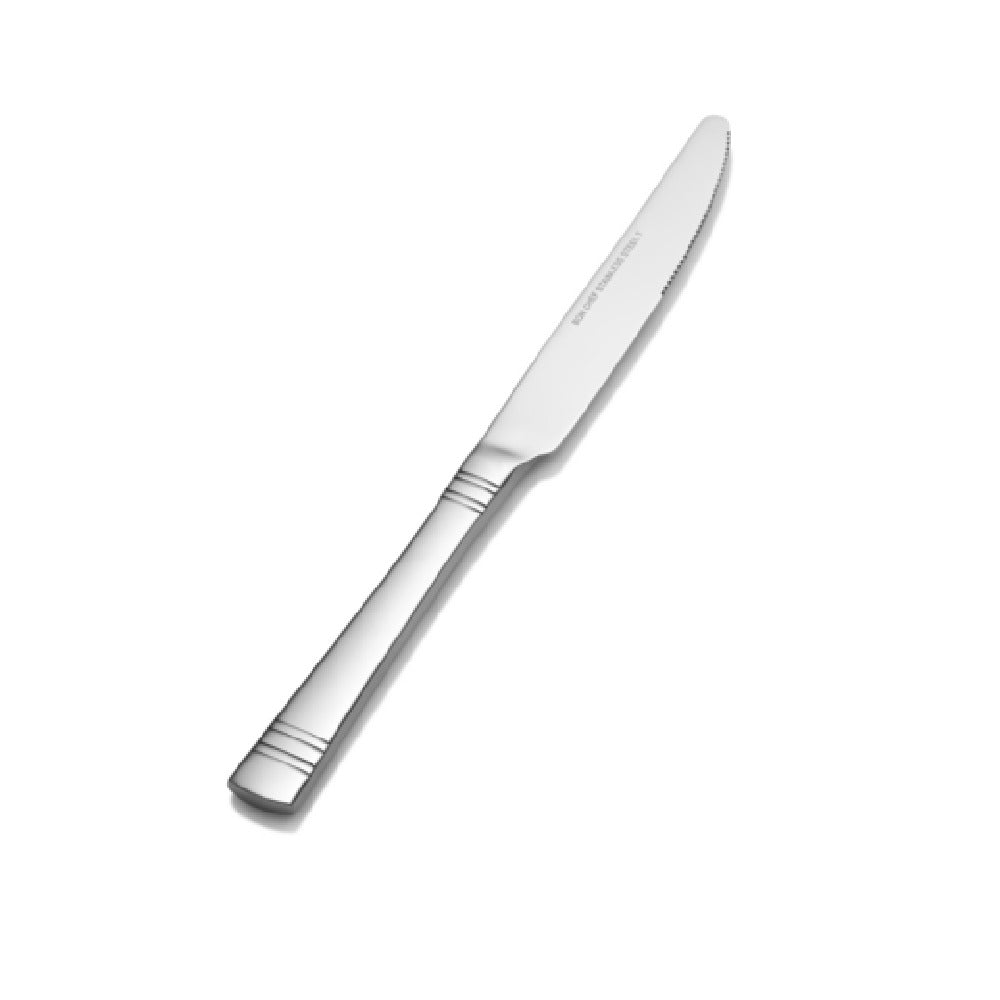 A commercial dinner knife is a lengthened and durable utensil designed for professional foodservice settings. Typically featuring stainless steel blades and reinforced handles, these knives are utilized in upscale restaurants, hotels, and catering establishments. The Bon Chef S2612 Julia European Dinner Knife is optimized for high-volume service with its corrosion-resistant blade and ergonomic solid handle, making it suitable for consistent daily use. It is primarily used for precise slicing, portioning, and presentation of prepared dishes in environments that demand reliability and longevity, such as banquet halls and fine dining venues.