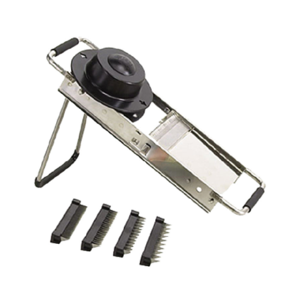The Browne Foodservice 5715000 Chef Mandoline Slicer features multiple julienne blades with precise 2, 4, 7, and 10 mm thickness options, facilitating uniform cuts for different recipes. Its stainless steel blades and frame ensure durability and resistance to corrosion in busy kitchens. The adjustable design simplifies setup and cleaning, reducing downtime. Perfect for mid-volume vegetable prep in restaurant catering or institutional kitchens, it streamlines workflow and enhances food presentation. Its revolving stand allows easy storage and versatility for various kitchen stations.