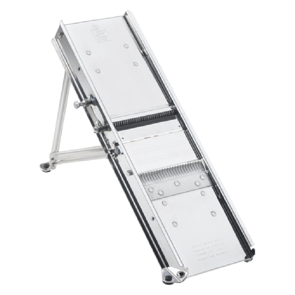 This mandoline slicer offers precise slicing with interchangeable stainless steel blades optimized for commercial food prep. Its robust stainless steel construction ensures durability under demanding workloads, while the foldable design simplifies sanitation and storage. Designed for foodservice operators, it enables efficient workflow integration for high-throughput vegetable and fruit preparation.