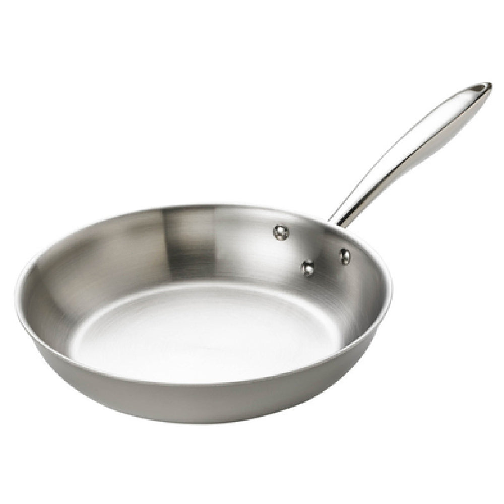 The Fry Pan employs tri-ply stainless steel with an aluminum core, measuring 9-1/2 inches in diameter and 2 inches in height, with a total weight of 3.3 lbs. It is induction-ready, uncoated, and features a riveted handle for durability. The pan withstands typical operating temperatures associated with professional cookery and is designed for consistent heat distribution across various heat sources. The construction materials are corrosion-resistant, suited for constant use and cleaning in demanding commercial environments. Its dimensions and sturdy build make it suitable for high-frequency usage, and it operates within standard kitchen temperature tolerances, ensuring food safety and product integrity during cooking and cleaning cycles.